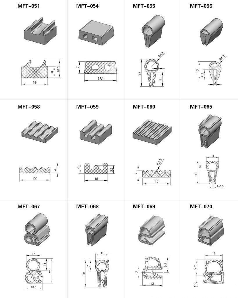 SiliconRubber(硅橡膠)優點:高彈性 低溫性能好,可以達到-50℃ 良好的耐候性,可達到30年的使用壽命 低壓縮永久變形,可達到15%--25% 多種多樣的顏色可以選擇,制品表面光滑 應用:門窗面對戶外的一側,需要經常開關動作的動態密封場合,不適合需要高撕裂強度的場合 EPDM(三元乙丙橡膠)優點:高機械性能,低溫性能好,可達-50℃。良好的耐候性,可達30年使用壽命。低壓縮永久變形.可達到20%--30% 應用:門窗面對戶外的一側,需要經常開關動作的動態場合 Flexible PVC Modify Flexible PVC(軟PVC改性軟 PVC) 優 點: 與 TPV,EPDM,SILICON相比價格便宜 ,可以回收, 容易加工制造成本比EPDM低50%--60% 多種多樣的顏色可以選擇。應用:多數用在普通門窗上。 TPV(EPDM/PP)聚烯烴類彈性體 優點:比重輕 0.9-1.0/cm3,EPDM 1.2-1.4/cm3 可以回收 容易加工,制造成本比EPDM低50%-60% 中等級別耐低溫性能,可達到-30℃ 多種多樣的顏色可以選擇,可以獲得啞光滑爽的表面 應用:多數情況是應用在門窗靜止密封部位及對壓縮永久變形沒有太高要求的場合。 SEBS苯乙烯類彈性體 優點:比重輕 0.9--1.0/cm3,EPDM 1.2-1.4cm3 可以回收 容易加工,制造成本比EPDM低50%-60% 多種多樣的顏色可以選擇,與TPV,EPDM,SILICON相比價格便宜,比PVC貴,與PVC,EPDM相比具有更好的彈性。 應用:多數情況是應用在門窗靜止密封部位及對壓縮永久變形沒有太高要求的場合